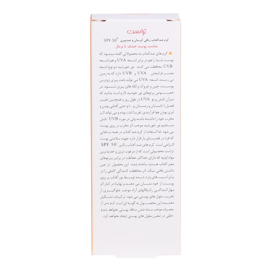 کرمهای ضدآفتاب رنگی تراست با SPF50+ از مرغوبترین و جدیدترین مواد اولیه موثره دارای حداکثر حفاظت دربرابر پرتوهای مضر خورشید ساخته شدهاند؛ این کرم با وجود بهرهمندی از بافتی سبک، دربرابر آسیبهای وارده توسط نور خورشید به خوبی از پوست محافظت و با مهار رادیکالهای آزاد از تخریب سلولهای پوستی جلوگیری میکند. همچنین با مصرف این محصول، بدون بسته شدن منافذ پوستی و ایجاد خلل در تنفس سلولهای پوستی، پوستتان آبرسانی میشود.