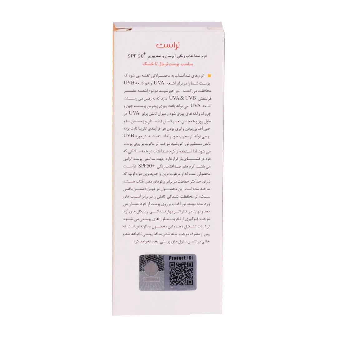 کرمهای ضدآفتاب رنگی تراست با SPF50+ از مرغوبترین و جدیدترین مواد اولیه موثره دارای حداکثر حفاظت دربرابر پرتوهای مضر خورشید ساخته شدهاند؛ این کرم با وجود بهرهمندی از بافتی سبک، دربرابر آسیبهای وارده توسط نور خورشید به خوبی از پوست محافظت و با مهار رادیکالهای آزاد از تخریب سلولهای پوستی جلوگیری میکند. همچنین با مصرف این محصول، بدون بسته شدن منافذ پوستی و ایجاد خلل در تنفس سلولهای پوستی، پوستتان آبرسانی میشود.